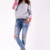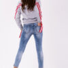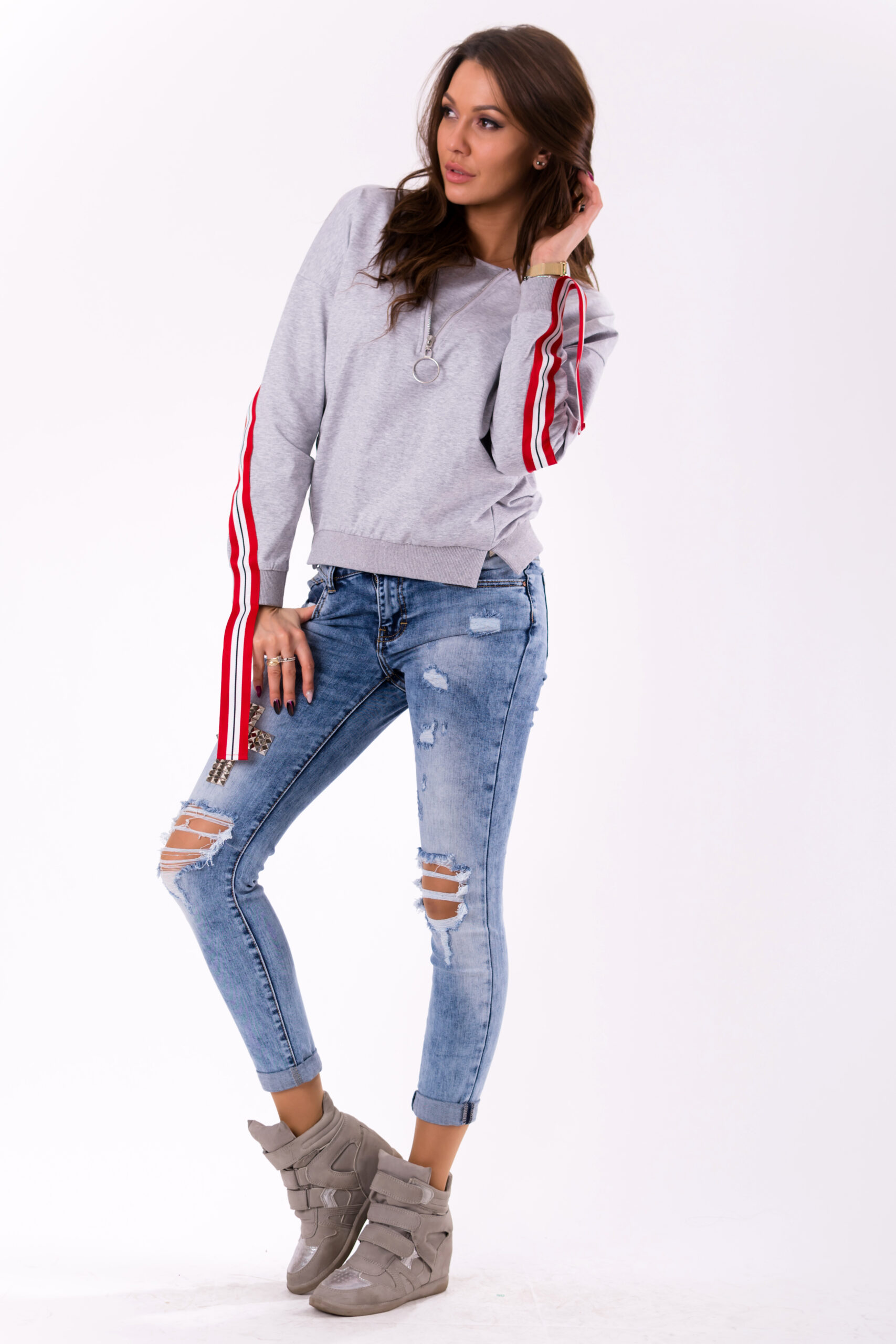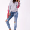 Sweatshirt mit Reißverschluss, rot-weißen und schwarzen Streifen.