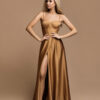 A long dress with straps and a slit on the leg.