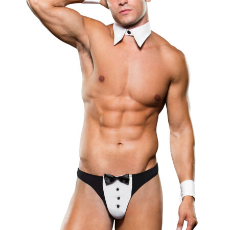 Alles geschmückt und nirgendwo hin, wo es dir gefällt! Dieses dreiteilige Set enthält schwarz-weiße Hosen im Bikini-Stil mit einer verspielten Fliege und Knöpfen auf der Vorderseite. Passende weiße Manschetten und ein weißer Kragen mit einem Knopf runden den Gesamtlook ab. Egal, ob es eine Nacht ist oder eine Nacht, Sie sind bereit!